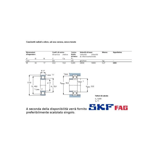 cuscinetto ad un giro di sfere (sfere a vista) a carico radiale.Int. mm.17 - Est. 62mm. - Spessore mm.17 SERIE SUPER PESANTE