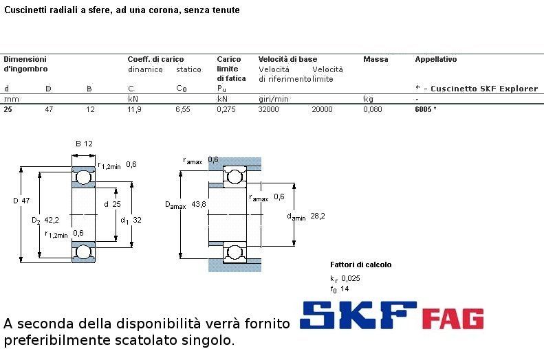 cuscinetto ad un giro di sfere (sfere a vista) a carico radiale.Int. mm.25 - Est. 47mm. - Spessore mm.12 SERIE LEGGERA