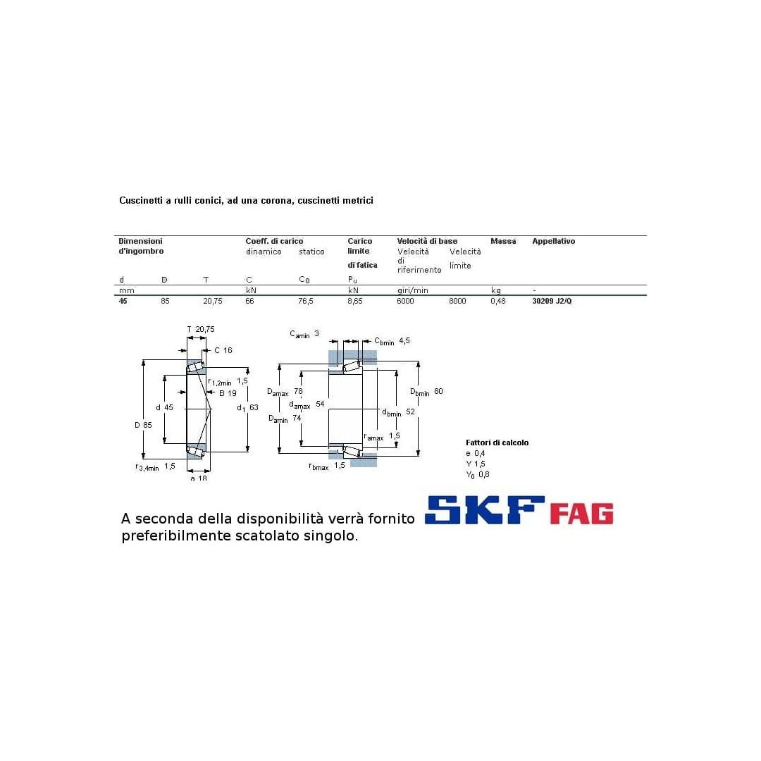 cuscinetto a rulli conici. Opportunamente montato tiene carico radiale ed assiale. Int. mm.45 - Est. 85mm. - Spessore mm.20,8. SERIE NORMALE. I rulli permettono, appoggiandosi su una linea di punti, di sopportare maggiore carico che le sfere, che appoggiano su un solo punto.