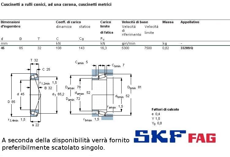 cuscinetto a rulli conici. Opportunamente montato tiene carico radiale ed assiale. I nt. mm.45 - Est. 85 mm. - Spessore mm. 32. I rulli permettono, appoggiandosi su una linea di punti, di sopportare maggiore carico che le sfere, che appoggiano su un solo punto.