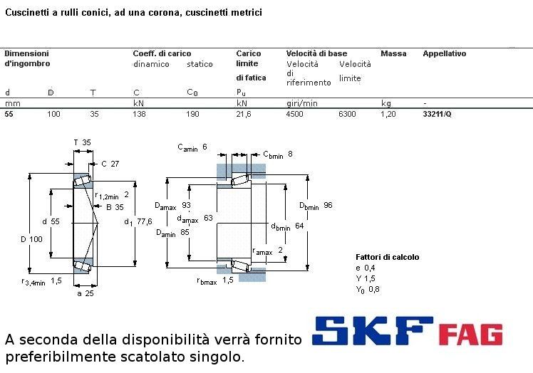 cuscinetto a rulli conici. Opportunamente montato tiene carico radiale ed assiale. I nt. mm.55 - Est. 100 mm. - Spessore mm. 35. I rulli permettono, appoggiandosi su una linea di punti, di sopportare maggiore carico che le sfere, che appoggiano su un solo punto.