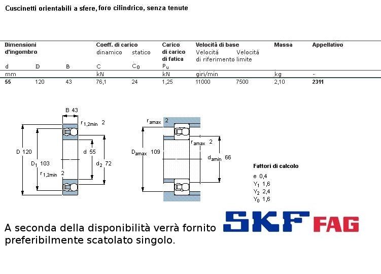 cuscinetto ad 2 giri di sfere orientabile a carico radiale (libero con sfere a vista). Int. mm. 55 - Est. 120 mm. - Spessore mm. 43. (sopporta il doppio del carico di portata pur tenendo invariate le misure int. ed est. delle serie ad 1 giro di sfere: 6300 ed in più, grazie all'orientabilità della sede int. sopporta vibrazioni e disassamenti dell'albero)