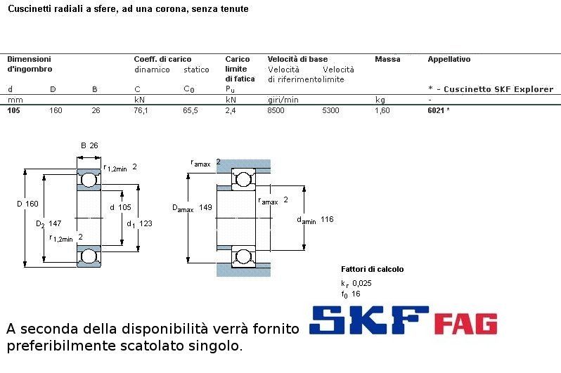 cuscinetto ad un giro di sfere (sfere a vista) a carico radiale.Int. mm.105 - Est. 160mm. - Spessore mm.26 SERIE LEGGERA