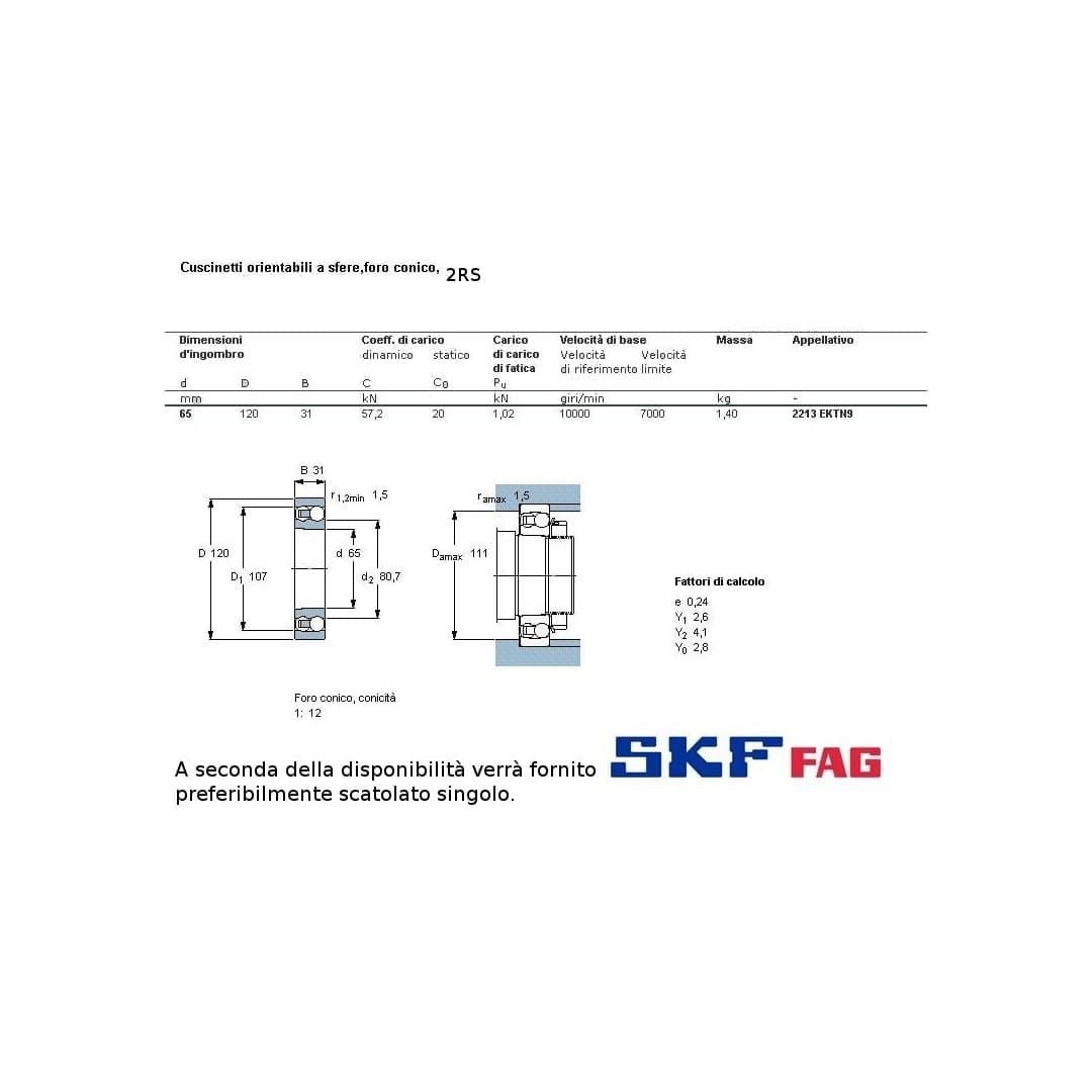 cuscinetto ad 2 giri di sfere orientabile a carico radiale con schermatura stagna in gomma ambo i lati. Int. mm.65 (foro conico) - Est. 120 mm. - Spessore mm.31 Lo spessore è più alto della serie 1200 per poter lasciare spazio al grasso all'interno degli schermi. (soluzione ideata per poter sopportare il doppio del carico di portata pur tenendo invariate le misure int. ed est. delle serie ad 1 giro di sfere: 6200 ed in più, grazie all'orientabilità della sede int. sopporta vibrazioni e disassamenti dell'albero, si monta con bussola.Ciò da la possibilità di poterlo infilare su un albero molto lungo e comunque di essere fissato più saldamente sull'albero.