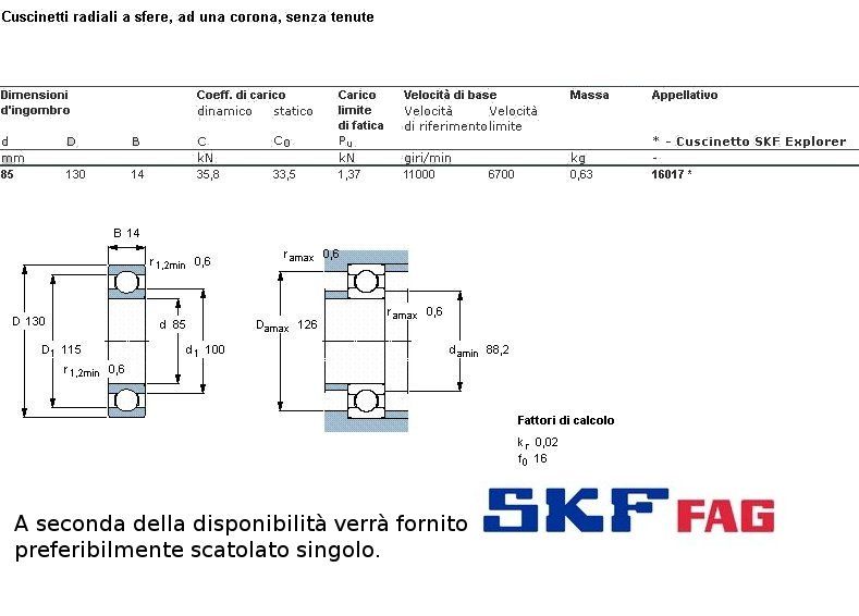 cuscinetto ad un giro di sfere (sfere a vista) a carico radiale.Int. mm.85 - Est. 130mm. - Spessore mm.14 SERIE SUPER LEGGERA