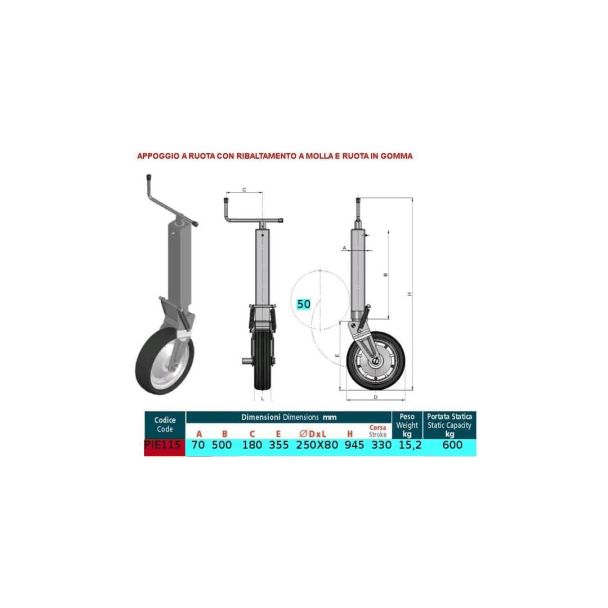APPOGGIO DM.70X450 CON RUOTA GOMMA DM.250 RIBALTAMENTO A MOLLA