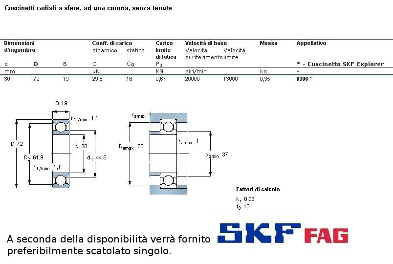 cuscinetto ad un giro di sfere (sfere a vista) a carico radiale.Int. mm.30 - Est. 72mm. - Spessore mm.19 SERIE PESANTE
