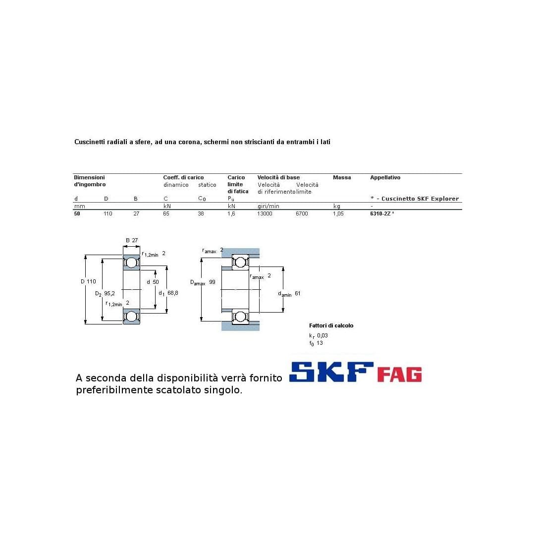 cuscinetto ad un giro di sfere a schermatura in ferro a carico radiale.Int. mm.50 - Est. 110mm. - Spessore mm.27 SERIE PESANTE