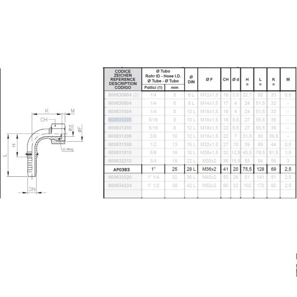 FEMMINA CURVA A 90 GRADI CON O RING E OGIVA A 24 GRADI DIN 28L. FILETTO 36 X 2 PER TUBO 1' R2. (ART. AP0030)