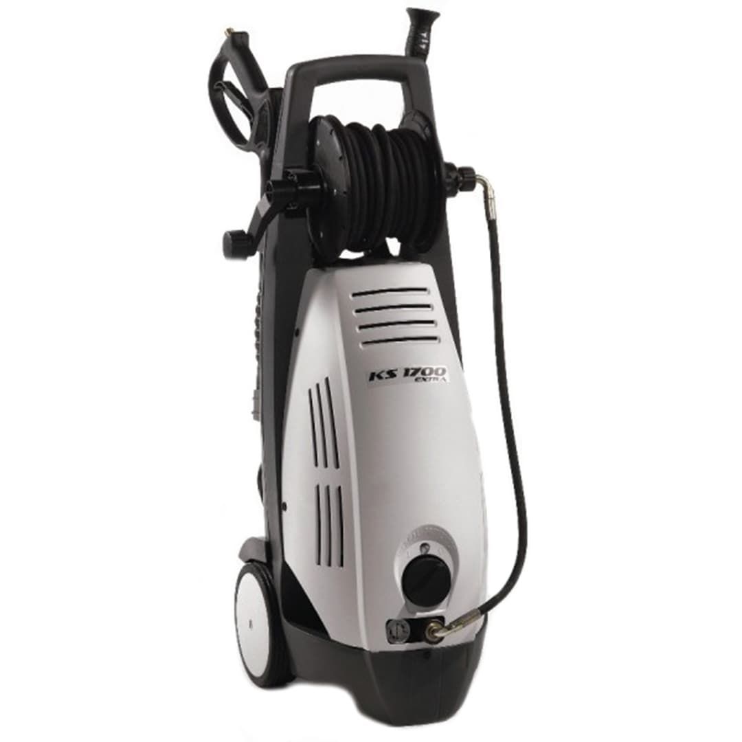 DROPULITRICE AD ACQUA FREDDA. 145 BAR. 230 V. KS 1700 EXTRA. MAX 145 BAR. TENSIONE 230 (1-50 HZ). POTENZA ASSORBIITA KW 2,4 - CV 3,1. POTENZA MOTORE KW 1,7. CV 2,3. R.P.M. 2800. PESO KG. 17-19. DIMENSIONI CM. 89 X 32 X 38. Questo modello di idropulitrice e' realizzato con pompa a tre pistoni assiali, flangiata direttamente al motore elettrico. Il dispositivo "EASY START" garantisce la potenza del motore in ogni condizione. Il dispositivo "TOTAL STOP" e' di serie in tutte le versioni. Questo modello di idropulitrice e' dotata di testata pompa in ottone e aspirazione del detergente diretta da serbatoio. (capacita' 1,8 litri) Dotazione standard: - pistola - lancia con regolazione angolare del getto - tubo alta pressione in gomma lungo 10 mt - attacco rapido aspirazione acqua - lancia con ugello rotante Portata max: 540 l/h Pressione max: 155 bar Tensione: 230 (1-50 Hz) Potenza assorbita: 2,7 Kw - 3,7 Cv Giri/min: 2800 rpm Peso: 17-19 kg Dimensioni: 89x32x38 cm