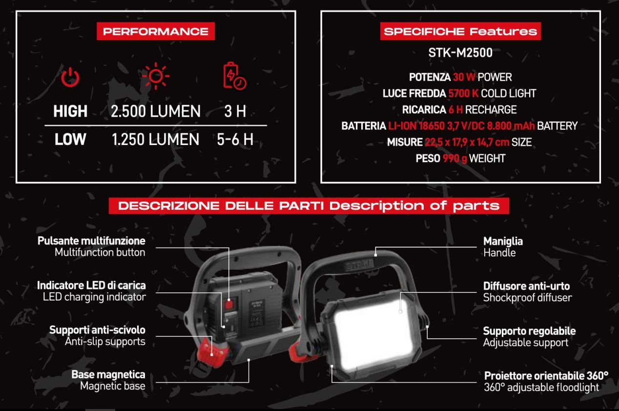 PROIETTORE LED PORTATILE RICARICABILE, 50W, 2500LM, IP54