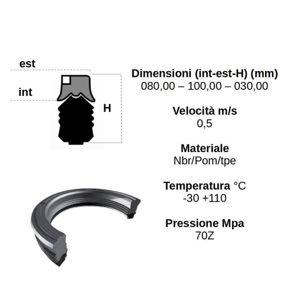 Guarnizione stelo PSE MM. 80, 100, 30, adatta per la tenuta su steli di cilindri idraulici in presenza di alte pressioni e in condizioni di esercizio particolarmente gravose quali vibrazioni e disallineamenti. Composta da tre elementi: una parte di tenuta in NBR, un anello di base in gomma telata con interpostoun anello anti-estrusione in acetalico. Adatto a macchine movimento terra, escavatori, gru, piattaforme di carico e macchine speciali.