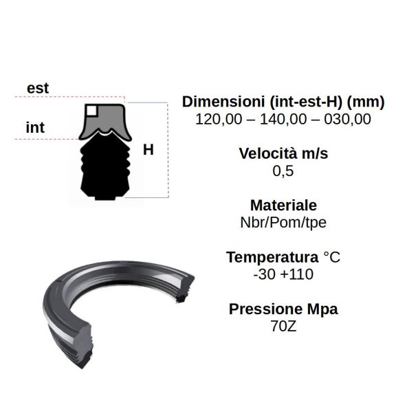 Guarnizione stelo PSE MM. 120, 140, 30, adatta per la tenuta su steli di cilindri idraulici in presenza di alte pressioni e in condizioni di esercizio particolarmente gravose quali vibrazioni e disallineamenti. Composta da tre elementi: una parte di tenuta in NBR, un anello di base in gomma telata con interpostoun anello anti-estrusione in acetalico. Adatto a macchine movimento terra, escavatori, gru, piattaforme di carico e macchine speciali.